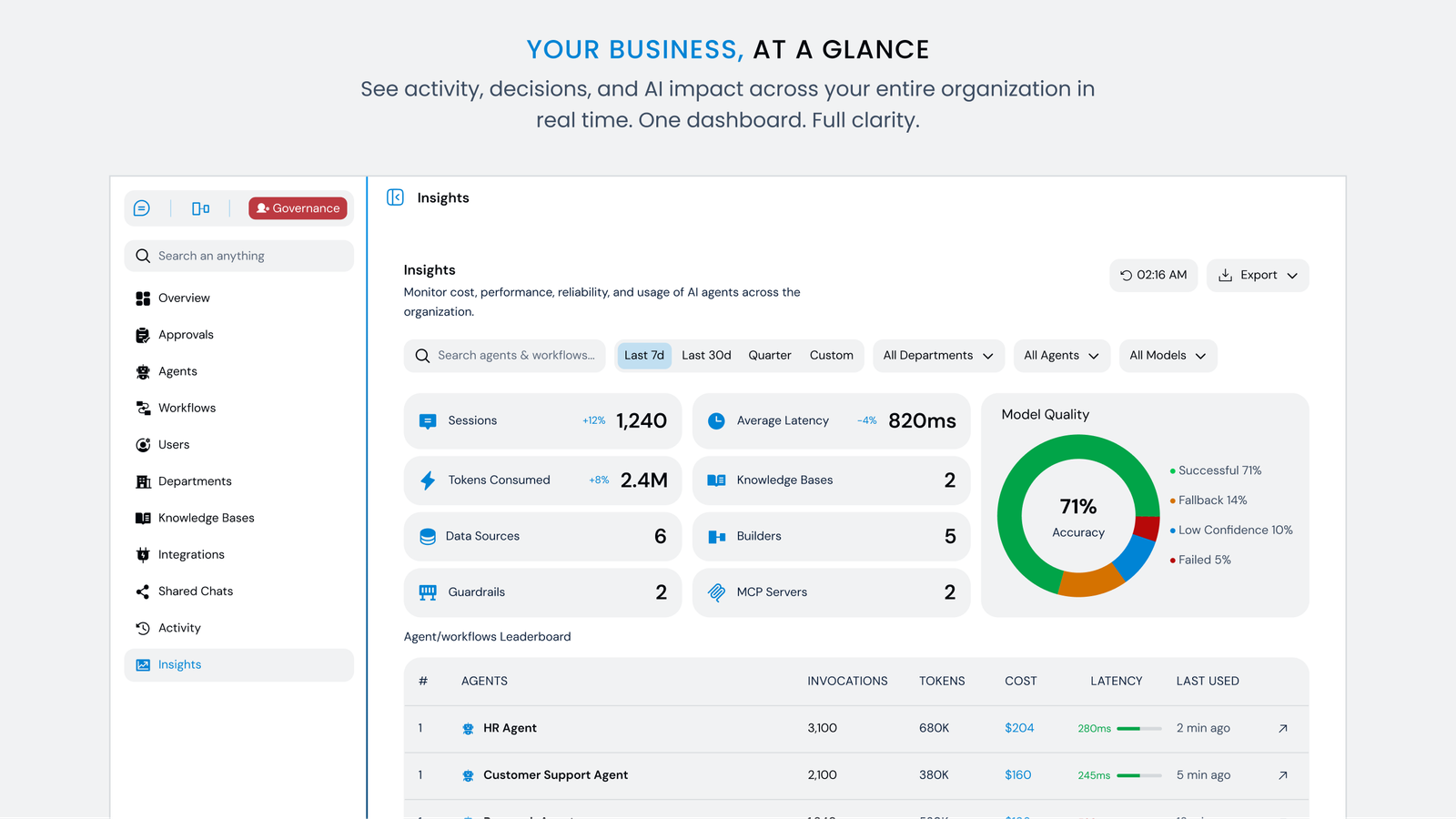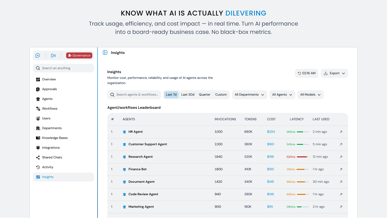Stay in control with live dashboards that track usage, performance, and ROI for all your AI agents. For example, you can see in real time how much time and cost each AI agent is saving your teams. These insights allow you to easily prove the value of AI to stakeholders and make quick adjustments if something isn’t delivering.
