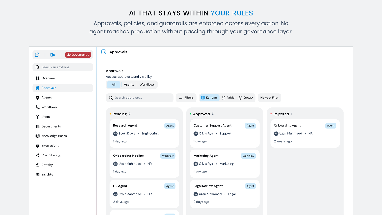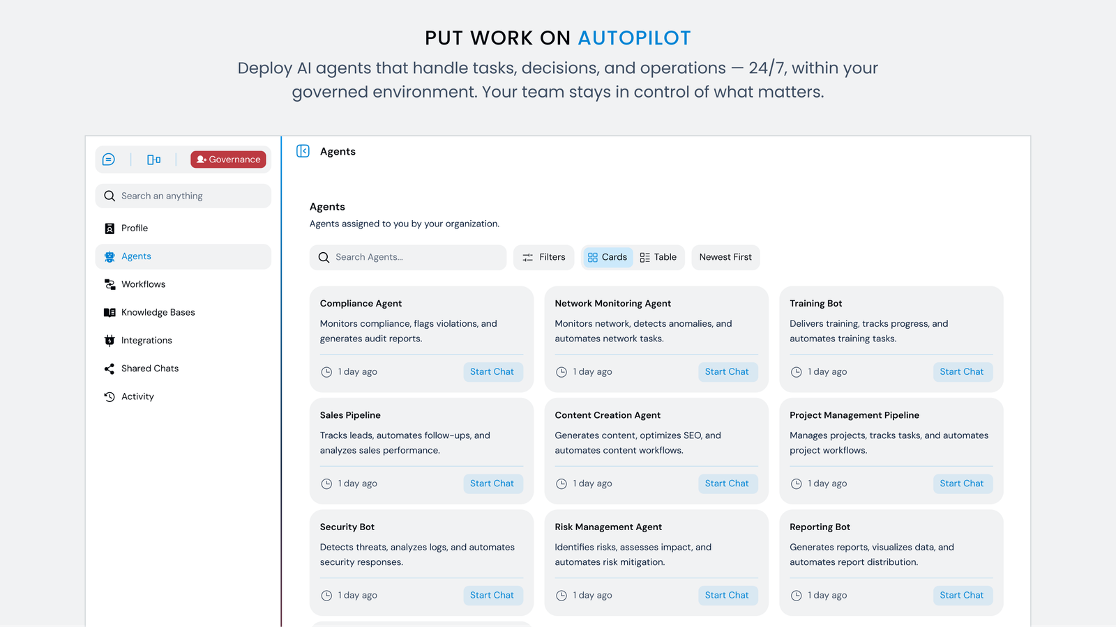 Launch and manage AI agents that seamlessly integrate with your existing systems, follow your policies, and generate results your business can measure from day one, with security and safety in mind.