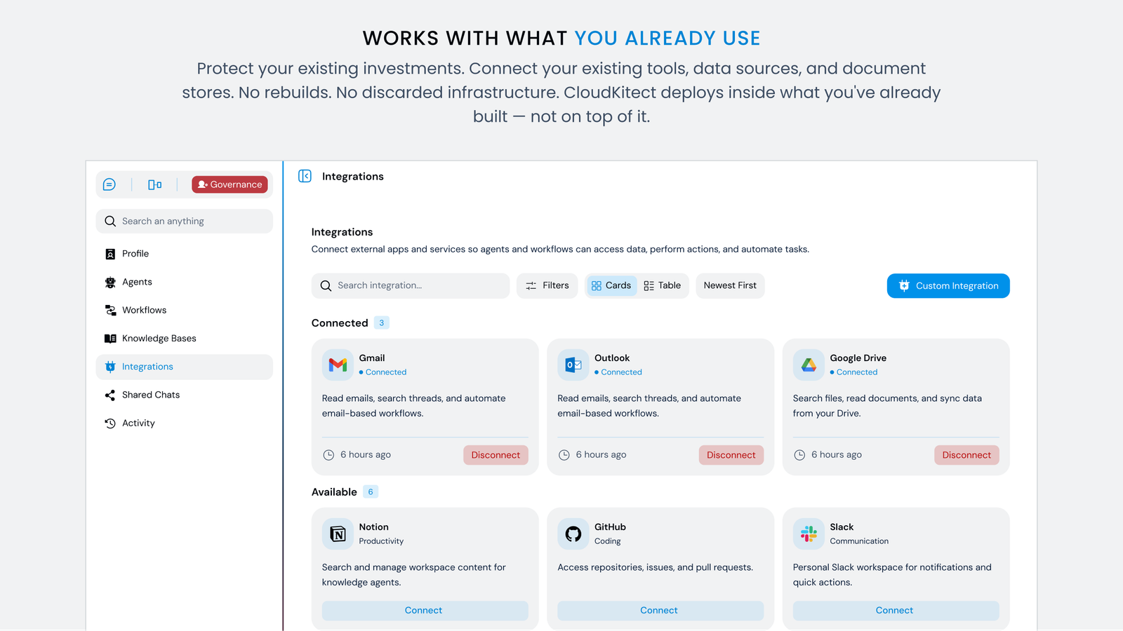 CloudKitect is more than just a platform; it includes our expert team of ex-AWS architects who help tailor AI solutions to your specific needs. We partner with you to ensure success, from building custom AI agents to integrating with your existing systems. Our dedicated support means you’re never alone on your AI journey.