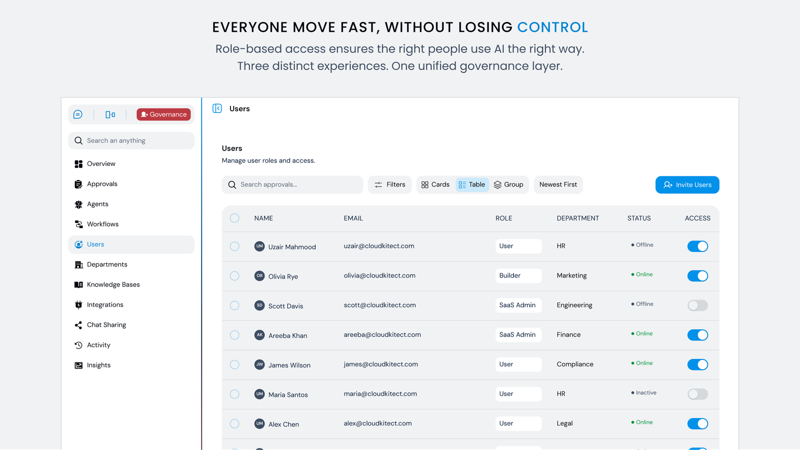 Three distinct experiences. One unified governance layer. Every role gets exactly what they need.