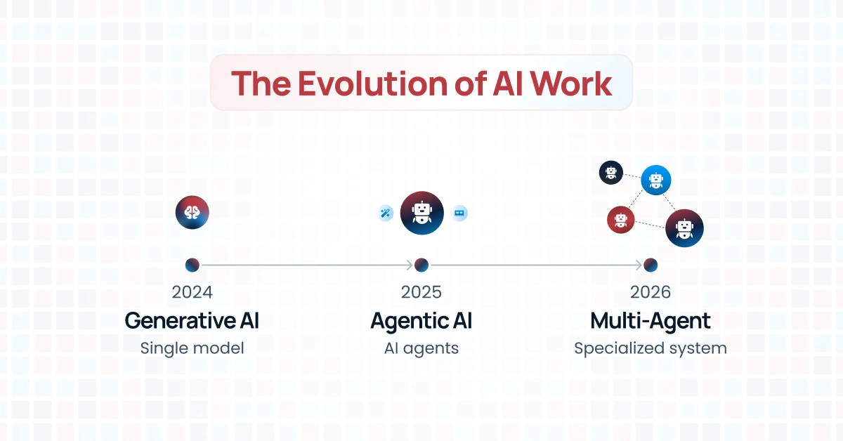 Infographic showing the evolution of AI work from 2024 to 2026—moving from generative AI single models, to agentic AI systems, to coordinated multi-agent architectures with specialized agents.