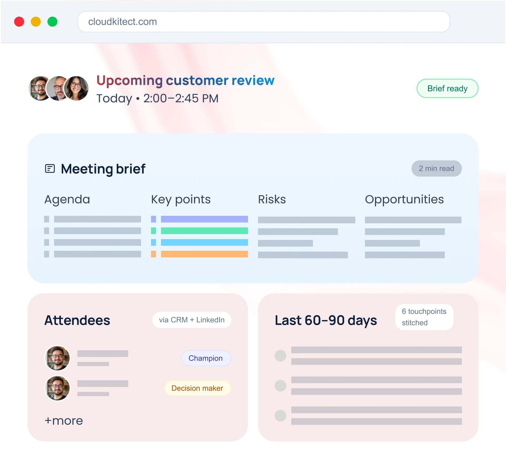 Compiles attendee background, recent activity, and past interactions into a single, structured prep view.